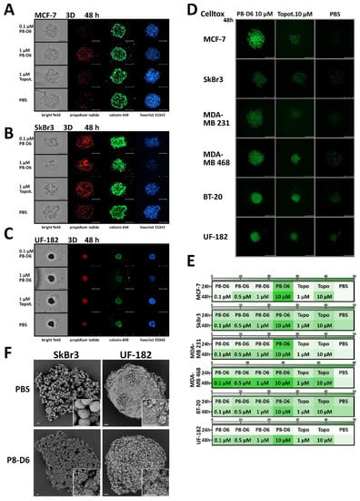 Furthermore, the relative caspase 3/7 activity was significantly increased in all P8-D6 treated spheroids (MCF-7, SkBr3, MDA-MB231, MDA-MB468, BT-20 and UF-182) compared to topotecan treatment and negative control [PBS] (Figure 5A–F). Topotecan induced an increased apoptosis rate, especially in cell lines and in UF-182 cells, compared to the negative control, similarly to the results obtained in the 2D monolayer experiments. However, topotecan was not as effective as P8-D6 in BC spheroids. Using live-dead staining followed by automated fluorescence and bright field microscopy confirmed that P8-D6 is a highly active compound compared to topotecan and PBS. It was clearly determined that for P8-D6 treatment compared to references, the number of dead cells increased and the number of viable cells and cell nuclei decreased. (Figure 6A–C). Cell toxicity was quantified during treatment by measuring the fluorescence signal of CellTox™ Green (Figure 6D,E). P8-D6 treatment, especially with the 10 µM concentration, induced a visually and quantitatively observable toxic effect in BC spheroids (MCF-7, SkBr3, MDA-MB231, MDA-MB468, BT-20 and UF-182). To characterize and visualize the surface chances of SkBr3 and UF-182 spheroids after treatment, scanning electron microscopy (SEM) was Houston, Texas (Figure 6F). Treatment with P8-D6 caused a decrease in membrane integrity in the SkBr3 and UF-182 spheroids’ surfaces, and thus, the spheroids became more porous in their structure.