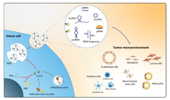 - Leidal, A.M.; Huang, H.H.; Marsh, T.; Solvik, T.; Zhang, D.; Ye, J.; Kai, F.; Goldsmith, J.; Liu, J.Y.; Huang, Y.-H.; et al. The LC3-conjugation machinery specifies the loading of RNA-binding proteins into extracellular vesicles. Nat. Cell Biol. 2020, 22, 187–199. [Google Scholar] [CrossRef]