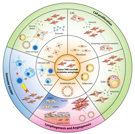 - Mowers, E.E.; Sharifi, M.N.; Macleod, K.F. Functions of autophagy in the tumor microenvironment and cancer metastasis. FEBS J. 2018, 285, 1751–1766. [Google Scholar] [CrossRef] [PubMed] [Green Version]