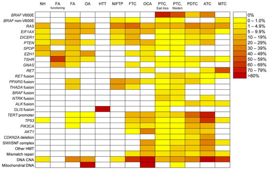 Frequency and pattern of genetic alterations across thyroid tumors. The heatmap depicts the frequency of non-synonymous mutations, deletions and fusions in selected genes, and copy number alterations (CNA). NH, nodular hyperplasia; FA, follicular adenoma; OA, oncocytic adenoma; NIFTP, non-invasive follicular thyroid neoplasm with papillary-like nuclear features; HTT, hyalinizing trabecular tumor; FTC, follicular thyroid carcinoma; OCA, oncocytic carcinoma; PTC, papillary thyroid carcinoma; OCA, oncocytic carcinoma; PDTC, poorly differentiated thyroid carcinoma; ATC, anaplastic thyroid carcinoma; MTC, medullary thyroid carcinoma; and HMT, histone methyltransferase. References for information used in this figure can be found in Table S1.