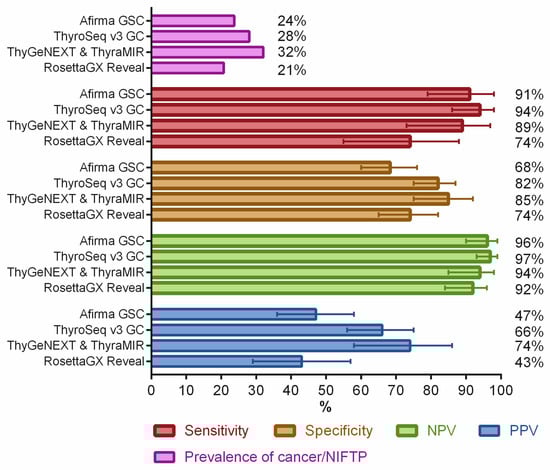 Diagnostic performance of commercially available molecular panels for thyroid nodules with indeterminate FNA cytology (atypia of undetermined significance/follicular lesion of undetermined significance and follicular neoplasm/suspicious for a follicular neoplasm). The length of the error bars is a 95% confidence interval. These data were obtained from clinical validation studies of Afirma Gene Sequencing Classifier (GSC) [118], ThyroSeq v3 Genomic Classifier (GC) [119], ThyGeNEXT and ThyraMIR [117], and RosettaGX Reveal [120]. NIFTP, non-invasive follicular thyroid neoplasm with papillary-like nuclear features; NPV, negative predictive value; and PPV, positive predictive value.