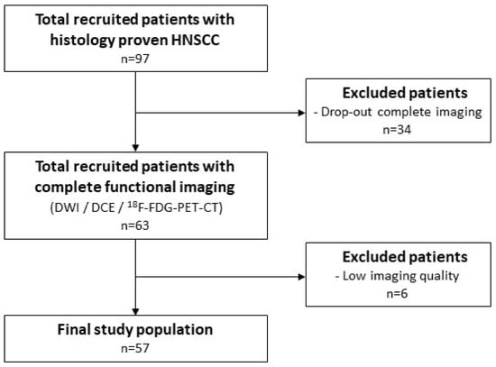 Between 2013 and 2019, 97 histological-proven HNSCC patients were recruited [13], of which 63 patients were recruited with complete functional imaging (Figure 2).