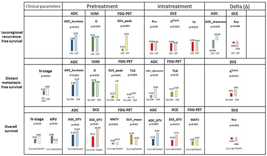 In the multivariate LRFFS analysis (Figure 3), pretreatment parameters ADC_kurtosis, D and SUV_peak, and intratreatment parameters Kep, Ktrans, Ve, TLG, Δ-ADC_skewness and Δ-Kep, were significantly prognostic (p < 0.05) (Table S4).