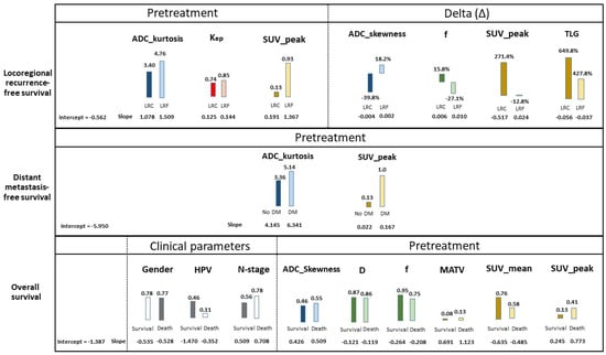 Significant multivariate prognostic pretreatment, intratreatment and delta parameters of all imaging techniques combined for locoregional recurrence-free survival, distant metastasis-free survival and overall survival (See Tables S2 and S3 for the complete tables). Overall, for each patient outcome, the intercept and the slopes per median parameter was shown. The median slopes were found lower in patients with locoregional control (LRC) than locoregional failure (LRF), lower in no distant metastasis (no DM) than distant metastasis (DM), and lower in survival than death, which resulted in a lower risk for an adverse outcome. HPV-negative tumors were marked with a 0, and HPV-positive tumors with a 1. Gender was marked with a 0 for females and 1 for males.