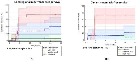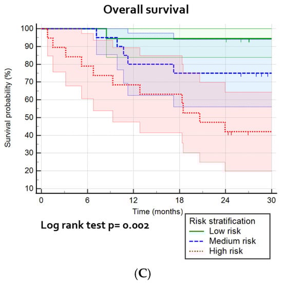 The risk stratification calculators were presented in Table 4, which shows the included parameters in the best prediction models. A division of patients into three risk groups, based on predicted probabilities (high/medium/low risk) (Figures S3–S5), shows a significant prediction of LRFFS (p = 0.002), DMFS (p < 0.0001) and OS (p = 0.002; Figure 5). The high risk sensitivity and specificity was for the best models for LRFFFS 0.61 and 0.83, for DMFS 0.71 and 0.82, and for OS 0.65 and 0.78, respectively (not tabulated).