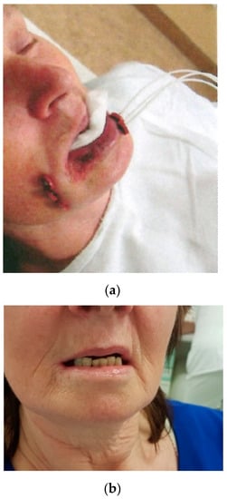 Brachytherapy can be used for the definitive treatment of SCC of the lip, providing excellent local control and satisfactory cosmetic results. LDR BT and HDR BT yield similar 5-year LC rates (around 95%) and 5-year OS rates ranging from 70 to 90% [45,46,47,48]. BT is mainly indicated in older patients to treat postoperative recurrences or tumours located in areas with difficult access (Figure 4). Treatment tolerance is excellent.