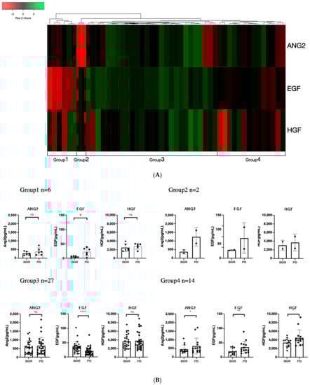 As shown in Figure 4A, based on clustering analysis, we classified the patients into four groups. As shown in Figure 4A,B, patients in group 1 (n = 6) had remarkably increased EGF levels between the best treatment response and PD points, those in group 2 (n = 2) had remarkably increased ANG-2 levels (n = 2), those in group 3 (n = 27) did not have increased ANG-2 and HGF levels but a substantial decrease in EGF level, and those in group 4 had significantly increased ANG-2, HGF, and EGF levels.