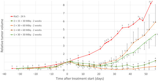 Relative tumor volume for mice that received a total activity of 30 (green triangles and rectangles) or 60 (brown diamonds and crosses) MBq 177Lu-octreotate. Mock-treated mice (red dots) received saline 24 h apart, with time offset to match tumor size at the start of treatment. The detailed treatment schemes for the groups are shown in Table 1. Data are given as mean values and error bars indicate standard error of the mean (SEM). Data labels indicate group size at the given time point.