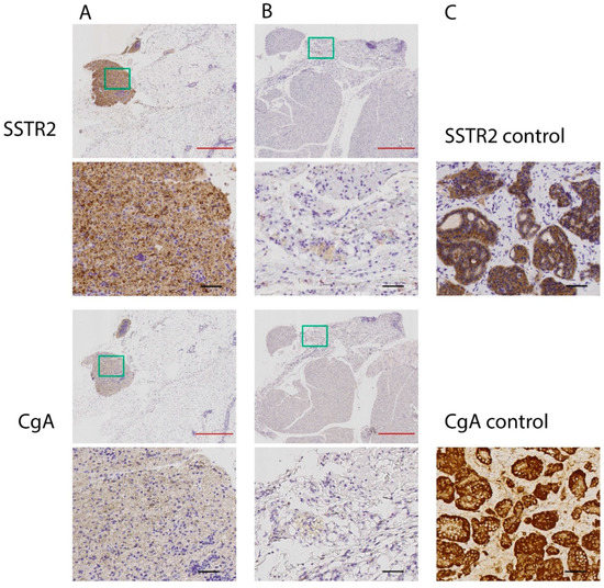 Immunohistochemical analyses of the expression of somatostatin receptor 2 (SSTR2) and chromogranin A (CgA) in the residual tissue from the two mice whose tumors receded completely (panel (A,B) respectively) after treatment with 2 × 30 = 60 MBq of 177Lu-octreotate. Results are presented in two magnifications, where the green box in the upper image demonstrates the location of the magnified image below, for each sample and staining. Two certified pathologists reviewed and assessed the stained sections. Weak staining was found for both SSTR2 and CgA in most parts of the residual tumor tissue samples (A,B), except for a small highly stained part in panel (A). Evaluation of the tissues concluded that no or very few malignant tumor cells were present in the sections, and that positive staining was mainly related to lymphocytes. Positive controls are demonstrated in panel (C), where a human small intestinal NET was used as a positive control for SSTR2 and CgA expression. Black bar = 50 µm, red bar = 500 µm.