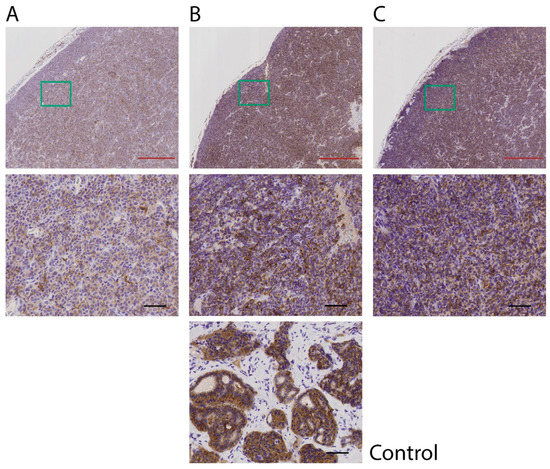 SSTR2 expression in three regrown GOT1 tumors from mice treated with 2 × 15 = 30 MBq of 177Lu-octreotate, analyzed immunohistochemically. Results are presented in two magnifications, where the green box in the upper image demonstrates the location of the magnified image below, for each sample. SSTR2-staining was positive in all tumor sections, although the mouse without tumor reduction (A) expressed lower expression of SSTR2 than the other two mice (B,C). Human small intestinal NET was used as a positive control. Two certified pathologists reviewed and assessed the stained sections. Black bar = 50 µm, red bar = 500 µm.