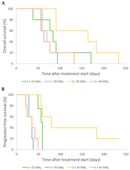 The median OS was 84 days (range 38–171 days) for the 2 × 15 = 30 MBq group, 63 days (59–94 days) for 1 × 30 MBq, 164 days (91–234 days) for 2 × 30 = 60 MBq, and 70 days (56–132 days) for 1 × 60 MBq group (Figure 4A). Median PFS was 56 days (range 49–59 days) for 2 × 15 = 30 MBq, 35 days (28–38 days) for 1 × 30 MBq, 80 days (56–>234 days) for 2 × 30 = 60 MBq, and 35 days (21–49 days) for 1 × 60 MBq group (Figure 4B).