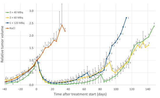 Relative tumor volume in GOT1-bearing mice before and after treatment with 177Lu-octreotate, normalized to the tumor volume at the start of treatment (day 0). Green triangles indicate an activity of 3 × 40 MBq, yellow circles 2 × 60 MBq, blue squares 1 × 120 MBq of 177Lu-octreotate, and brown circles saline only, with multiple fractions given 24 h apart. Detailed description of the treatment schedules of the groups is given in Table 1. Data are given as mean values, and error bars indicate standard error of the mean (SEM). Data labels indicate group size at the given time point.