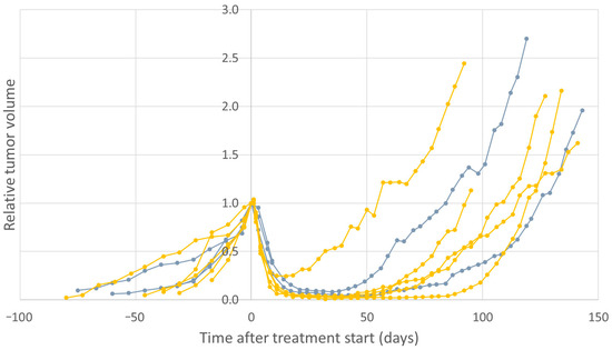 Relative tumor volume in GOT1-bearing mice that received daily (yellow, n = 5) or weekly (gray, n = 3) injections of an activity of 2 × 60 MBq to a total of 120 MBq of 177Lu-octreotate. One mouse in the weekly treated group lost body weight and was euthanized nine days after the start of treatment.