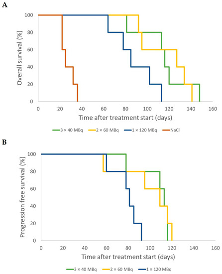 The median OS was 25 days (range 22–36 days) for the control group, 116 days (81–148 days) for 3 × 40 MBq, 127 days (92–141 days) for 2 × 60 MBq, and 85 days (64–113 days) for 1 × 120 MBq. The maximal overall survival after 2–3 administrations was prolonged by 20–25% compared to a single dose (Figure 7A). The median PFS was 113 days (78–116 days) for 3 × 40 MBq, 109 days (57–120 days) for 2 × 60 MBq, and 81 days (60–92 days) for 1 × 120 MBq (Figure 7B).