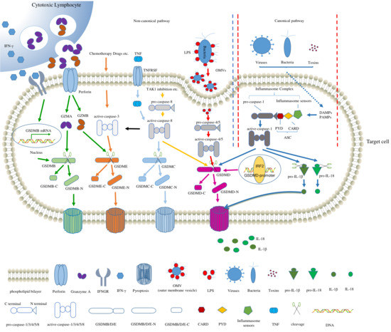 - Zhou, Z.; He, H.; Wang, K.; Shi, X.; Wang, Y.; Su, Y.; Wang, Y.; Li, D.; Liu, W.; Zhang, Y.; et al. Granzyme A from cytotoxic lymphocytes cleaves GSDMB to trigger pyroptosis in target cells. Science 2020, 368, eaaz7548. [Google Scholar] [CrossRef]