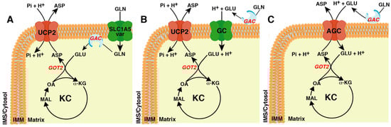In order to produce aspartate, glutamine must enter the KC as α-ketoglutarate (α-KG). The critical enzyme in this metabolic pathway is glutaminase (GA) [22]. This enzyme converts glutamine to glutamate, which is further transformed by glutamate dehydrogenase (GDH) or glutamate-oxaloacetate transaminase (GOT) to α-KG. At least four isoforms of GA [23], with a different subcellular localization (mitochondrial, cytosolic, and nuclear) [24,25,26], are present in humans. Here, we will focus on glutaminase C (GAC or GLS C) [23], a shorter isoform of the kidney type GA (KGA or GLS) that is localized to mitochondria [26] and frequently induced in cancer cells [23]. Although it is commonly accepted that GAC is bound to the inner mitochondrial membrane, the localisation of its catalytic site, whether in the matrix or in the intermembrane space, is still a matter of debate [26,27,28,29,30]. This is a crucial point because if the catalytic site is matrix facing a glutamine transporter would be required (Figure 1A). However, if the catalytic domain faces the intermembrane space, glutamate would be released outside the mitochondria thus requiring a glutamate transporter [31,32,33].