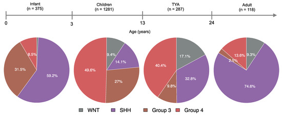 Medulloblastoma (MB) is the most common malignant primary brain tumour in children, although, 20% of all MBs occur in patients older than 15 years of age. It has long been known that MB is a very heterogeneous disease with varied clinical outcomes. Based on gene expression or DNA methylation profiling, numerous studies showed that MB could be classified into four discrete subgroups: Wingless activated (WNT), Sonic Hedgehog (SHH), Group 3, and Group 4 [8,9,10]. Recent integrated analysis has suggested the existence of further MB subtypes within each subgroup, two WNT subtypes: WNTα and WNTβ; four SHH subtypes: SHHα, SHHβ, SHHγ, and SHHδ; three Group 3 subtypes: 3α, 3β, and 3γ; and three Group 4 subtypes: group 4α, group 4β, and group 4γ [11]. Among subgroups, only Group 3 MBs predominantly occur in children, whereas all other three subgroups occur both in children and young adults. TYA patients with MB may have a slightly different course of disease biology when compared with children and adults. The data on clinical outcomes and molecular features are scarce in TYAs, and to date, no comprehensive characterisation of MB in the TYA population has been described.