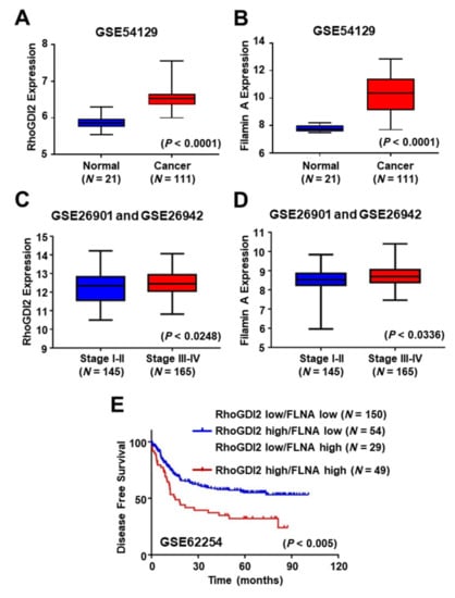 - Cho, H.J.; Baek, K.E.; Park, S.M.; Kim, I.K.; Choi, Y.L.; Cho, H.J.; Nam, I.K.; Hwang, E.M.; Park, J.Y.; Han, J.Y.; et al. RhoGDI2 expression is associated with tumor growth and malignant progression of gastric cancer. Clin. Cancer Res. 2009, 15, 2612–2619. [Google Scholar] [CrossRef] [PubMed]