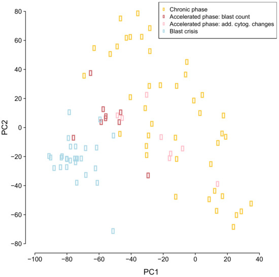 Principal component analysis of genome-wide CML expression data. Individual patient samples are represented by colored dots. The color of a dot defines the CML phase of the sample (yellow: chronic phase, red/pink: accelerated phase, light blue: blast crisis).