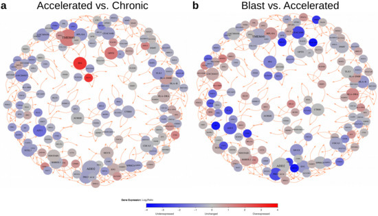 Network-based visualization of genes with increased network connectivity and corresponding expression behavior for pairwise comparisons of CML phases. Nodes represent selected genes with at least two outgoing links to other genes that were present in at least 90 of the 100 learned networks. Node sizes are proportional to their out-degrees and nodes are colored according to expression change observed for the pairwise comparison of CML phases (blue: underexpressed, gray: unchanged, red: overexpressed). Predicted activating links between genes are shown in orange. Links can represent direct or indirect regulatory dependencies or may only represent correlations between expression levels of genes. The network (a) shows expression alterations of the selected genes with increased connectivity to other signature genes for the comparison of the accelerated to the chronic phase. The network (b) shows the expression behavior of these genes for the comparison of the blast to the accelerated phase.