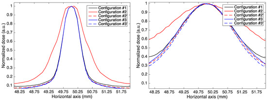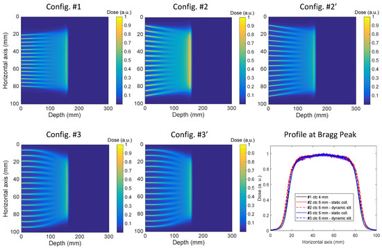 The broadening effect is caused by the irradiation of a given slit by PBS spots that are not aligned with it. As a consequence, a percentage of each minibeam proton flux comes from PBS spots centered on nearby slits and is, therefore, deflected with a non-optimized magnetic field. The broadening effect is in fact eliminated when a dynamic slit is used (Configurations #2′ and #3′) as the entire minibeam proton flux is generated only by PBS spots with the corresponding off-axis coordinate and is, therefore, deflected by an optimized magnetic field. When using a magnetic field inside the water phantom (Configurations #3 and #3′), the difference between the use of a static collimator and a dynamic slit is less pronounced and becomes visible only after few centimeters of water thickness (Figure 3, right picture). This is because magnetic fields affect proton trajectories only after they enter the water phantom and beam widening is largely due to scattering.