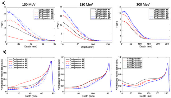 (a) Peak-to-Valley Dose Ratio (PVDR) as a function of depth and (b) depth dose of the first central valley in the five analyzed configurations for three different proton energies.