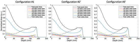 Since the best results with monoenergetic beams were obtained using a dynamic aperture, we studied the creation of an SOBP only in Configuration #1, Configuration #2′, and #3′. Figure 5 shows the depth-dose profiles of the optimized SOBPs in these three configurations.