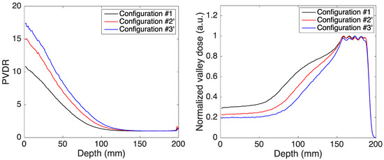 The PVDR and valley dose curves obtained in the three configurations are shown in Figure 6.