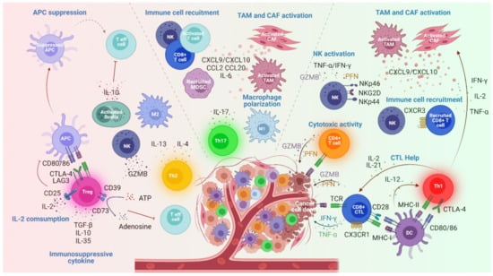 | Th2 | GATA3+ IRFA4+ | IL-4, IL-5, IL-9,IL-13 | -Induce M2 macrophage infiltration and cancer eradication [23] -NK stimulation [24,25,26] | -Promote B cell activation and IL-10 production [27,28] | Promotion |