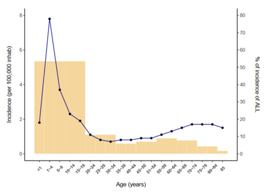 Incidence of ALL per 100,000 inhabitants by age (2014–2018) according to the SEER database [2].