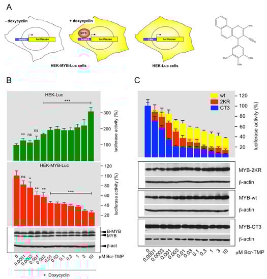 The MYB reporter cell line HEK-MYB-Luc [43] was used to screen chemical libraries containing approximately 62,000 small molecules, resulting in the identification of 2-Amino-4-(3,4,5-trimethoxyphenyl)-4H-benzo[h]chromene-3-carbonitrile as a highly active MYB-inhibitory compound. The screening system, the chemical structure of the compound (for simplicity referred to as Bcr-TMP, for “benzochromene-trimethoxyphenyl”) and its effect on the luciferase activity in HEK-MYB-Luc and HEK-Luc cells are illustrated in Figure 1A,B. A comparison of the effects of Bcr-TMP on the luciferase activity of HEK293T-cells transiently transfected with a MYB-dependent reporter plasmid and expression vectors for wt MYB, MYB-2KR (the activated MYB construct expressed in the HEK-MYB-Luc cells) and MYB-CT3 (a C-terminally truncated MYB construct) is shown in Figure 1C. The activity of all three MYB constructs was suppressed by Bcr-TMP; however, wild-type MYB was slightly less sensitive than the other MYB versions. MYB expression remained constant or slightly increased with higher concentration of Bcr-TMP.