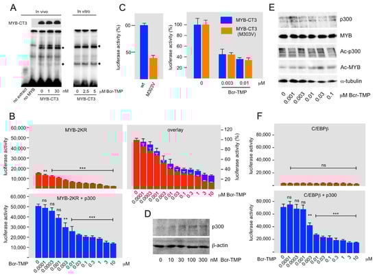 Bcr-TMP suppresses MYB activity in a p300-dependent manner. (A) EMSA assay with nuclear extracts from HEK293T cells expressing MYB-CT3, as marked below the lanes, and cultivated for 16 h with the indicated concentrations of Bcr-TMP. Nuclear extract from un-transfected cells was used as control. A Western blot showing MYB-CT3 expression in aliquots of the nuclear extracts is presented at the top. Binding assays were performed with a radiolabeled oligonucleotide containing a consensus MYB binding site. MYB-specific protein-DNA-complexes are labeled by black dots. In addition to using nuclear extracts from cells treated with Bcr-TMP in vivo, EMSA assays were performed by adding compounds directly to the in vitro binding reactions (last three lanes). (B) HEK293T cells were transiently transfected with the MYB-dependent reporter plasmid pGL4-5xMRE(GG)-Myc and expression vectors for MYB-2KR and p300, as shown at the top. Transfected cells were treated with Bcr-TMP for 16 h and subjected to luciferase assays. The columns show the absolute luciferase values in arbitrary numbers and the panel on the right (overlay) shows the luciferase activity normalized to that of untreated cells. (C) The left panel shows the luciferase activity of HEK293T cells transfected with reporter plasmid pGL4-5xMRE(GG)-Myc and expression vectors for MYB-CT3 and MYB-CT3(M303V). The right panel shows the luciferase activity of HEK293T cells transfected in the same manner and treated without or with the indicated concentrations of Bcr-TMP for 16 h before harvesting and measuring luciferase activities. The difference in activity between MYB-CT3 and the M303V mutant was compensated by expressing the luciferase activities as percent of the activity of the untreated cells. (D) Expression of endogenous p300 in HEK293T cells treated for 16 h with or without Bcr-TMP. (E) HEK293T cells transfected with expression vectors for MYB-2KR and p300 were treated for 16 h with Bcr-TMP, as indicated at the bottom. Total cell extracts were then analyzed by Western blotting for expression of p300, MYB-2KR, acetylated p300, acetylated MYB-2KR, and β-actin. (F) HEK293T cells were transiently transfected with the C/EBP-dependent reporter plasmid pmim3mim-Luc and expression vectors for human C/EBPβ and p300, as indicated. Transfected cells were treated with Bcr-TMP for 16 h and subjected to luciferase assays. The columns show the absolute luciferase values in arbitrary numbers. Asterisks in panels B and F indicate statistical significance (ns: non-specific; ** p < 0.01; *** p < 0.001; Student’s t-test). The uncropped Western blots have been shown in Figure S2.