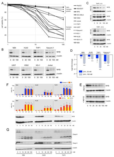 Bcr-TMP suppresses viability and MYB expression and induces cell death and differentiation in AML cell lines: (A). Inhibition of cell viability by Bcr-TMP. Non-hematopoietic cell lines (HEKT, HepG2, and hTERT-RPE) and MYB-expressing hematopoietic cell lines (HL60, THP1, NB4, OCI-AML3, K562, Jurkat, U937, Kasumi1, KG-1, MV-4-11) were treated for 24 h with the indicated concentrations of Bcr-TMP and analyzed by a MTT assay. The figure shows percent viable cells relative to untreated cells. (B) Western blot analysis MYB expression in hematopoietic cell lines treated for 24 h with Bcr-TMP. (C) Western blot analysis of MYB expression in THP1 cells treated for 4 or 12 h with Bcr-TMP in the absence or presence of proteasome inhibitor MG132. (D) RT-PCR analysis of MYB mRNA expression in selected cell lines treated for 24 h with Bcr-TMP. (E) Western blot showing MYB and β-actin expression in MCF7 cells treated for 12 h with the indicated concentrations of Bcr-TMP in the absence or presence of MG132. (F) NB4, HL60 and THP1 cells treated for 48 h with Bcr-TMP were stained with FITC-annexin V and propidium iodide (top) or with antibodies against CD11b and CD14 (middle) and analyzed with a flow cytometer. Western blots (bottom) show expression of MYB and β-actin. (G) Western blots showing the effect of Bcr-TMP on caspase 3 and 8 expression. Asterisks in panels D and F indicate statistical significance (* p < 0.05; ** p < 0.01; *** p < 0.001; Student’s t-test). The uncropped Western blots have been shown in Figure S3.