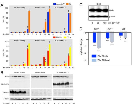 Bcr-TMP suppresses AML cells in a MYB-dependent manner: (A) HL60 cells infected with a control lentivirus (HL60-control) or a lentivirus encoding C-terminally truncated MYB (HL60-CT3) or C/EBPβ (HL60-C/EBPβ) were treated for 72 h with the indicated concentrations of Bcr-TMP, followed by staining with annexin V and propidium iodide (top) or antibodies against CD11b and CD14 (bottom) and analysis by flow cytometry. (B) Western blot analysis of MYB and C/EBPβ expression of the cells treated as in panel A. (C,D) HL60 cells treated for 2 h with 30 or 100 nM Bcr-TMP. The cells were the analyzed by Western blotting for MYB and β-actin expression (C) and by RT-PCR analysis for MYC, GFI1 and KIT mRNA expression (D). Asterisks indicate statistical significance (* p < 0.05; ** p < 0.01, *** p < 0.001, Student’s t-test). The uncropped Western blots have been shown in Figure S4.