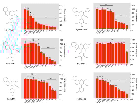 Structure–activity analysis of Bcr-TMP-related compounds. The columns in each panel show the relative luciferase activity in HEKT cells transfected with reporter plasmid pGL4-5xMRE(GG)-Myc and expression vector for MYB-2KR, treated for 16 h with the indicated concentrations of the compounds shown to the left. Asterisks indicate statistical significance (* p < 0.05; ** p < 0.01, *** p < 0.001, Student’s t-test).