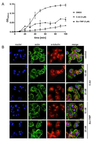 518A2 melanoma cells (1 × 105 cells/mL, 0.5 mL/well) were seeded on coverslips in 24-well cell culture plates and incubated for 24 h under cell culture conditions (37 °C, 5% CO2, 95% humidity). After adding 10 and 25 nM of Bcr-TMP or combretastatin A4 or the vehicle DMSO, the cells were incubated for 24 h (37 °C, 5% CO2, 95% humidity). The cells were washed with cytoskeletal buffer (100 mM PIPES, 3 mM MgCl2, 138 mM KCl, 2 mM EGTA, 300 mM sucrose, pH 6.8), fixed and permeabilized in 3.7% formaldehyde and 0.2% Triton X-100 in cytoskeletal buffer for 5 min at RT. As additional fixation step, the cells were incubated with ice-cold EtOH for 10 s and rehydrated in PBS. After blocking with 1% BSA in PBS for 30 min the cells were treated 2 h with a primary antibody against alpha-tubulin (anti-alpha-tubulin, mouse monoclonal antibody, Invitrogen/Life Technologies). The cells were then washed three times with PBS, followed by a 1 h incubation with AlexaFluor®-546 conjugated secondary antibodies (goat anti-mouse IgG-AF-546, Invitrogen). Actin and nuclei staining was performed with Acti-Stain 488 phallodin (Cytoskeleton, Inc., Denver, CO, USA) and DAPI (1 µg/mL) for 1 h in the dark. Finally, the cells were washed three times with PBS and the coverslips were embedded in ProLongTM Glass Antifade Mountant. Nuclei, actin filaments and microtubules were documented by confocal microscopy (Leica Confocal TCS SP5).