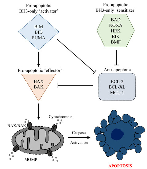 The intrinsic apoptosis pathway, also known as the ‘stress’ or ‘mitochondrial’ apoptosis pathway, is tightly regulated by BCL-2 proteins; a family of pro- and anti-apoptotic proteins which share between one and four BCL-2 homology (BH) domains (BH1, BH2, BH3, BH4) and interact on the mitochondrial outer membrane [68]. The pro-apoptotic BCL-2 proteins can be subcategorized as BH3-only ‘activators’ (BIM, BID, PUMA), BH3-only ‘sensitizers’ (BAD, NOXA, HRK, BIK, BMF), and pore-forming ‘effectors’ (BAX, BAK). Counteracting these are the anti-apoptotic/pro-survival BCL-2 proteins, including MCL-1, BCL-2, BCL-XL, BCL-W, and BFL-1 (Figure 1) [69]. The balance between pro- and anti-apoptotic BCL-2 family proteins is critical in determining cell fate decisions, and manipulating this balance to breach the apoptotic threshold is an attractive strategy in cancer therapeutics [70].