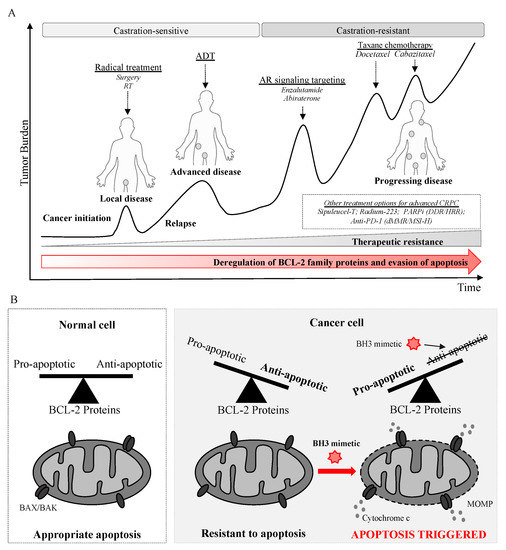 Evasion of apoptosis drives tumorigenesis, progression and therapeutic resistance in prostate cancer providing rationale for targeting anti-apoptotic BCL-2 proteins with BH3 mimetics. (A). An example of prostate cancer progression and treatment. Three-quarters of men are diagnosed with localized disease and can be treated with curative intent (prostatectomy or radiotherapy). However, an increasing percentage of men are being diagnosed with de novo metastatic disease and relapse occurs in 20 to 50% after radical treatment for early-stage disease. Most advanced prostate cancers respond to androgen deprivation therapy (ADT) but they inevitably progress from castration-sensitive to castration-resistant prostate cancer (CRPC). Approved therapies for advanced CRPC include androgen receptor (AR) signaling targeting, taxane-based chemotherapy and radium-223 but primary and acquired resistance is common. Tumors with aberrations in homologous recombination repair (HRR) and DNA damage response (DDR) genes can be treated with Poly(ADP-ribose) polymerase (PARP) inhibitors and anti-PD-1 therapy can be used for defective mismatch repair (dMMR) or microsatellite instability-high (MSI-H) disease. Treatment sequence can vary considerably between patients depending on the nature of disease; AR signaling targeting and docetaxel can be also used for castration-sensitive disease. (B). The balance of pro- and anti-apoptotic BCL-2 proteins is critical in determining cell fate decisions. BCL-2 proteins are finely balanced in normal cells which can initiate apoptosis appropriately on exposure to cell death stimuli. In cancer cells, BCL-2 proteins are deregulated, increasing the threshold for apoptosis and promoting cell survival. BH3 mimetics bind to anti-apoptotic BCL-2 proteins, lowering the threshold and can trigger BAX/BAK homo-oligomerization, mitochondrial outer membrane permeabilization (MOMP), the release of cytochrome c and induction of apoptotic cell death.