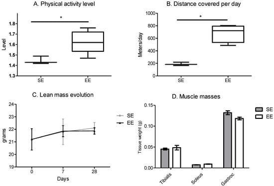 The enriched environment increased the level of physical activity, represented by the total energy expenditure divided by the minimum energy expenditure, for the EE mice compared to the SE mice (Figure 1A). This result is associated with a rise in the distance covered per day per mouse for the EE compared to the SE mice (Figure 1B). Despite the increase in spontaneous physical activity, lean mass was similar in both groups during the time window (Figure 1C) and at sacrifice, the muscle masses of the posterior legs were similar between the two groups (Figure 1D).