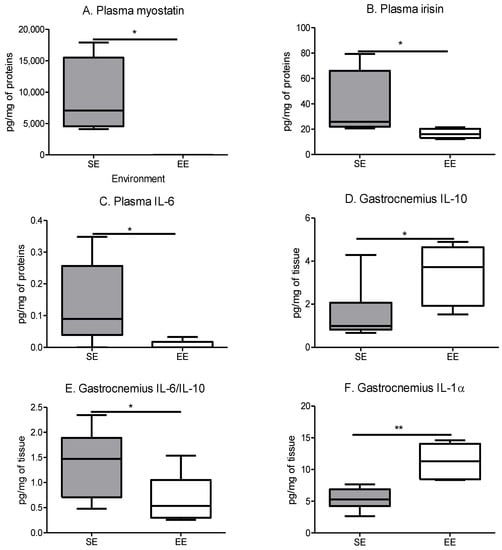 The enriched environment modifies myokine secretions like imposed physical activity. (A) Plasma myostatin concentration. (B) Plasma irisin concentration. (C) Plasma IL-6 concentration. (D) Quantity of IL-10 in gastrocnemius. (E) Ratio of IL-6/IL-10 in gastrocnemius. (F) Quantity of IL-1α in gastrocnemius. Results are in pg/mg of tissue and mean ± SEM (n = 5 mice muscle or plasma samples/group). Data were analysed by Mann–Whitney t-test. Representative data are shown: * p < 0.05, ** p < 0.01, SE vs. EE.