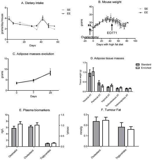 Dietary intakes are equivalent, and the high-fat diet induces an adipose mass gain. (A) Dietary intake per day per mouse, results are in grams per day per mouse. (means of 10 mice/group/days) (B) Mouse weight during experimentation. Day 0 corresponds to the beginning of the high-fat diet. The surgeries are indicated by an arrow on the graph. Results are in grams. (means of 10 mice/group/days) (C) Time course of adipose masses per mouse analysed by EchoMRI. (means of 10 mice/group/days) (D) adipose tissue masses at sacrifice in grams (means of 10 mice/group) (E) Quantity of oestradiol, cholesterol and triglycerides. (n = 5 mice plasma samples/group) (F) Quantity of cholesterol and triglycerides. (n = 5 mice tumour samples/group). Data are mean ± SEM. Data were analysed by ANOVA repeated measures.