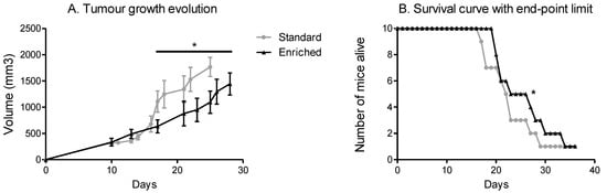 Even though the weight gain of adipose tissue was similar, tumour growth differed according to the housing environment of the mice. The mice in the EE had slower tumour growth compared with the mice in the SE significantly from day 18 of growth onwards (Figure 4A). In relation to tumour growth, the SE mice reached the 2mm₃ limit point faster than the EE mice. The SE mice showed reduced survival compared to the mice with spontaneous physical activity (Figure 4B).
