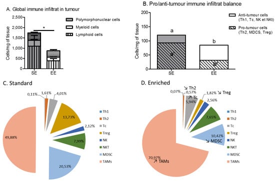 The tumour microenvironment of the EE mice had a lower global immune infiltrate in terms of cell number than the SE mice, mainly due to a decrease in lymphoid cell infiltrate (Figure 5A). More specifically, this decrease is associated with a change in the balance of pro- and anti-tumour immune cells. Antitumour immune cells, such as Th1, Tc or NK, were more present in the microenvironment of the EE group’s tumours compared to the SE group’s tumours (Figure 5B). Conversely, protumour immune cells, such as Th2 and MDCS, were less present in the EE group’s tumours compared to the SE group’s tumours (Figure 5B). A more precise analysis of the immune cell subtype showed a trend towards increased infiltration of cytotoxic T lymphocytes and of TAMs within the EE group (Figure 5C). A decrease in the regulatory T cells and the MDSCs, two immune-cell types linked to aggressiveness of the tumour, was also seen in the tumour microenvironment of the EE group compared to the SE group (Figure 5C,D).