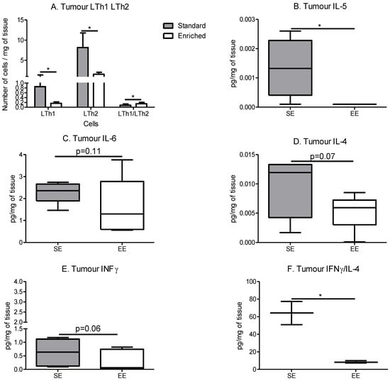 IL-5 was significantly decreased in the tumours of the EE group compared to the SE group (Figure 6B), IL-4 also showed a decreasing trend (Figure 6D). For proinflammatory cytokines, a decreasing trend is also observed with IL-6 and INF-γ within the EE group tumours compared to the SE group (Figure 6C and Figure 6E, respectively). In addition, the ratio IFN-γ/IL-4 decreased in the tumour microenvironment of the EE group compared to the SE group (Figure 6F), resulting in a more anti-inflammatory cytokine environment.