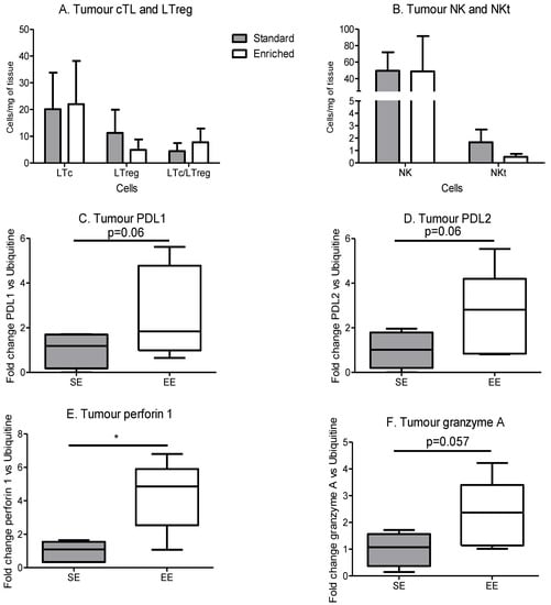Tumour cytotoxic T lymphocytes (Tc) and T regulator lymphocytes (Treg) contents were similar between the SE and EE groups (Figure 7A). However, PDL1 and 2 expression tended to increase in the tumours in the EE group compared to the SE group (Figure 7C,D). NK content was similar between both groups but NKt presented a small and nonsignificant decrease in EE group compared to SE group (Figure 7B). Perforin 1 expression was significantly increased in the EE group (Figure 7E) and granzyme A expression showed a nonsignificant increase in the same group (Figure 7F). All these data suggest a regulated and functional immune response inside the tumour. As the immune infiltrate comes from other lymphoid organs, we checked immunity inside the thymus (maturation site of T lymphocytes), spleen and inguinal lymph nodes, the major and local immune pools near the tumour.