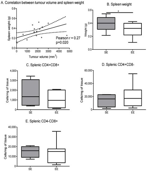 Tumour volume was positively correlated with spleen weight (Figure 8A). Indeed, the spleen weight was significantly lower in the EE group compared to the SE group (Figure 8B). Despite this decrease, the environment did not affect the CD4/CD8 lymphocyte cell populations in the spleen (Figure 8C–E).