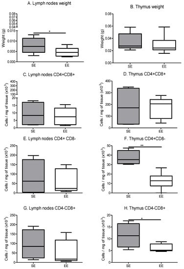 Within the lymph nodes, the same results were found. Their weight was significantly lower for the EE group compared with the SE group, but the CD4/CD8 lymphocytes populations were not significantly different between the groups (Figure 9A,C,E,G).