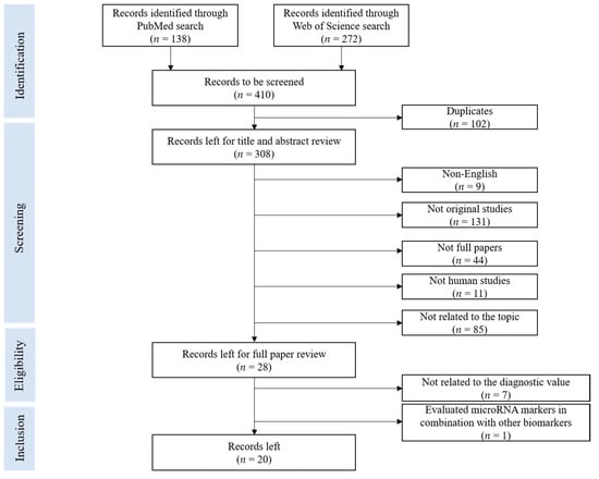 APA StyleZhao, Z., Zhu, A., Bhardwaj, M., Schrotz-King, P., & Brenner, H. (2022). Fecal microRNAs, Fecal microRNA Panels, or Combinations of Fecal microRNAs with Fecal Hemoglobin for Early Detection of Colorectal Cancer and Its Precursors: A Systematic Review. Cancers, 14(1), 65. https://doi.org/10.3390/cancers14010065