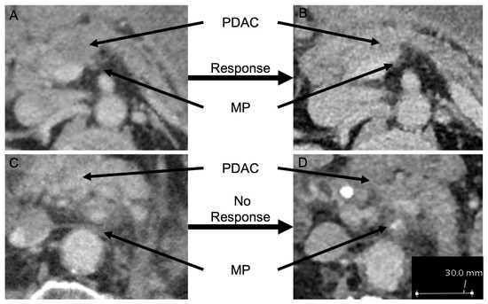 Preoperative multiphasic multi-detector CTs (MDCT) following neoadjuvant therapy were available for re-evaluation. The CTs were retrospectively analyzed by experienced hepatopancreaticobiliary radiologists, blinded for resection status and postoperative staging. Local tumor response was analyzed [23]. (Figure 1). Scoring criteria of tumor response was scored by the mesopancreatic attenuation of the fatty tissue in terms of diminished/decreased mesopancreatic fat stranding and/or decreased tumor size with an smaller encasement of the SMA or celiac trunk/common hepatic artery. Due to the limited number of enrolled patients, no subgroup analyses (MPS1-3) was performed. Patients were subgrouped into tumor response or no tumor response.