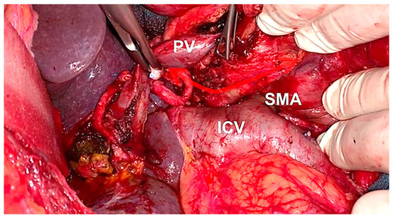 Intraoperative picture of situs during MPE. Note the strict dissection around the caval vein (ICV) and abdominal aorta until the origin of the superior mesenteric artery (SMA) and celiac trunk (red arrow). (ICV, inferior caval vein, PV: portal vein, SMA: superior mesenteric artery).
